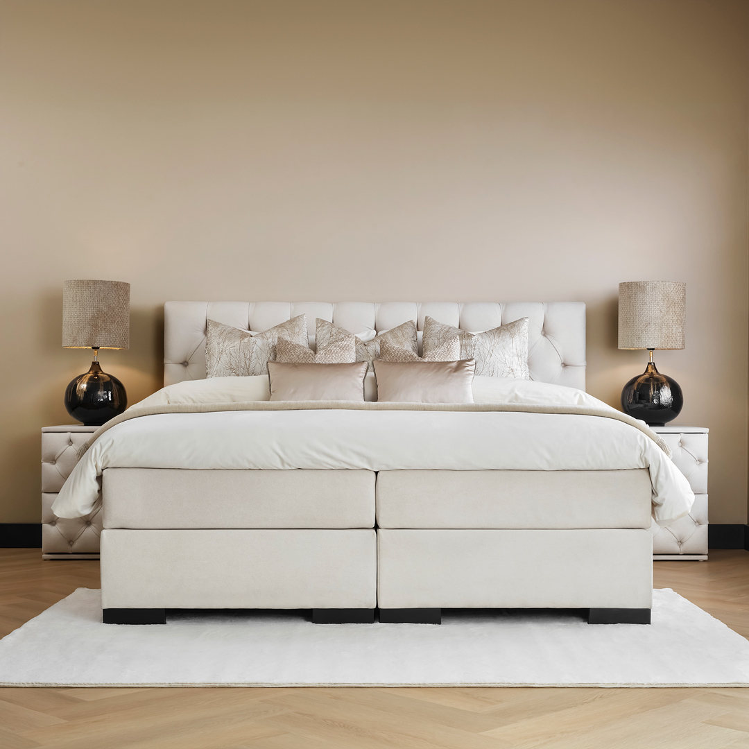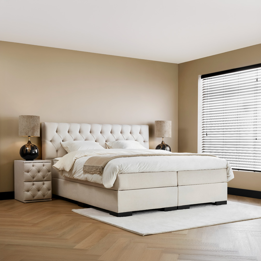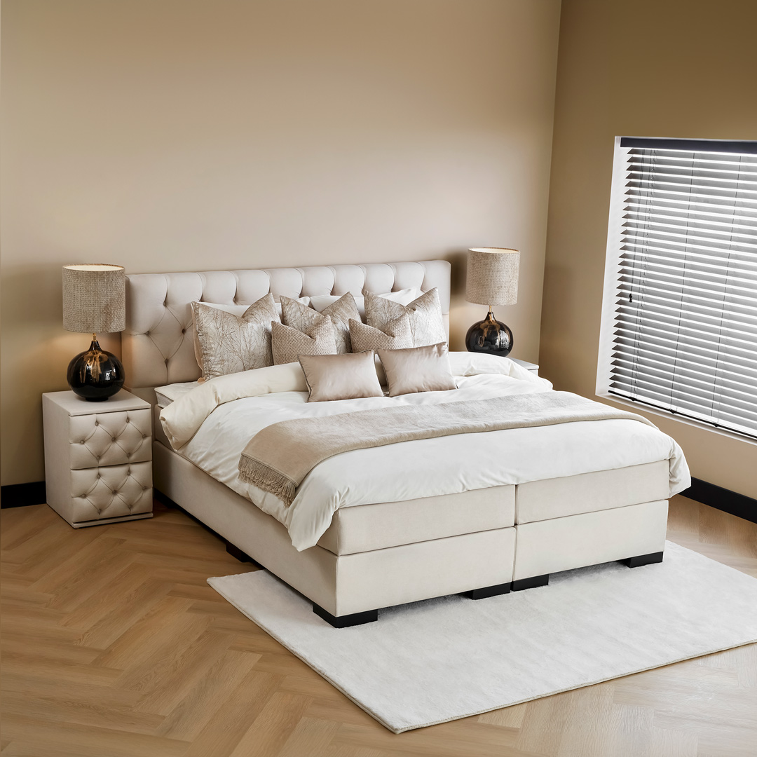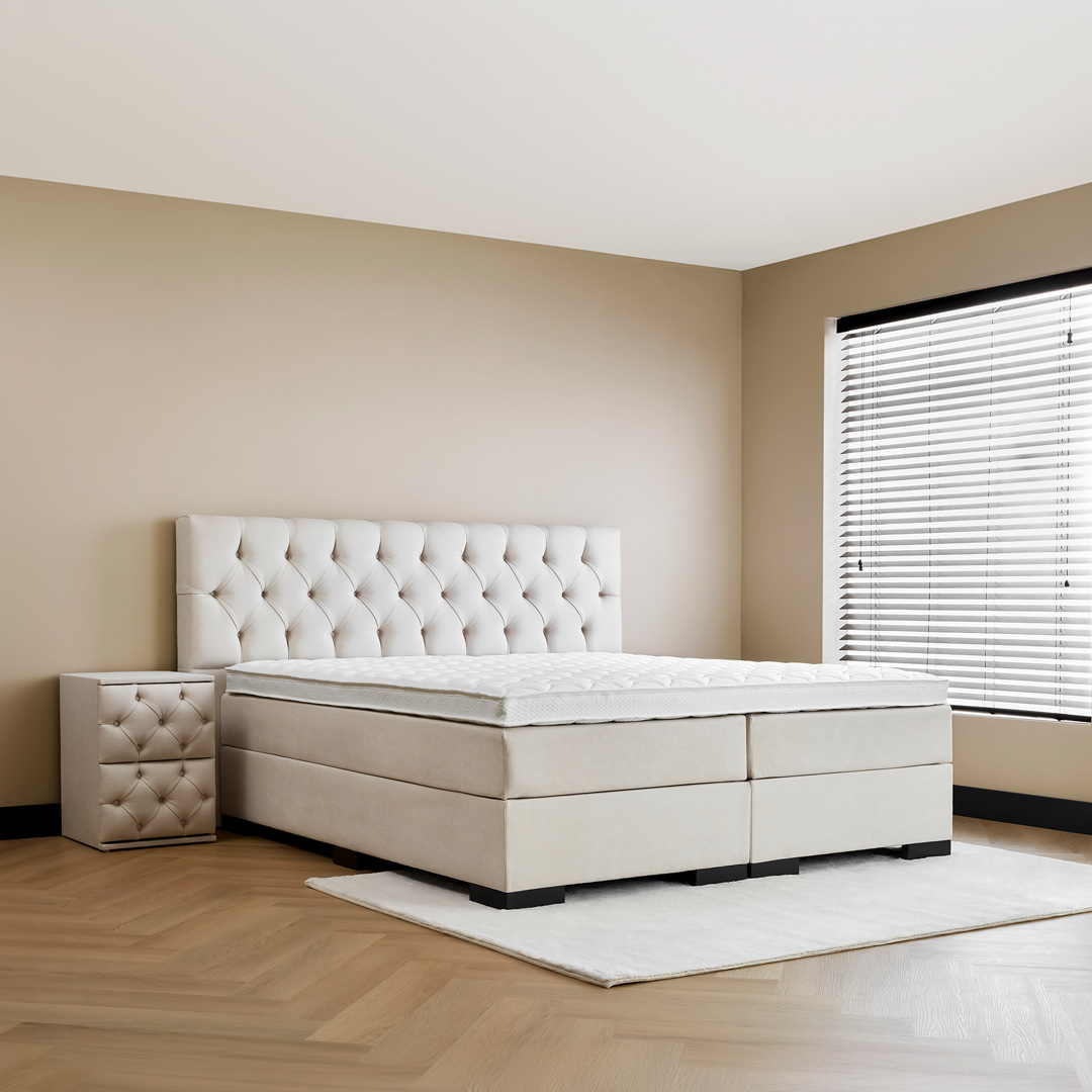 De boxspring Chester blinkt uit op de huidige markt door het luxueuze ontwerp. Kenmerkend aan deze boxspring is dat deze op maat speciaal voor u in Nederland word geproduceerd. Het grote voordeel hiervan zijn de vele opties die mogelijk zijn tijdens het samenstellen van uw boxspring. Dit uit zich in de vele keuzes qua maten, comfort en uitstraling. Ook de snelle levertijd is hier een groot voordeel van. Door nauw samen te werken met de leverancier van deze Chester boxspring kunnen wij u dan ook dit prachtige bed met een top kwaliteit aanbieden tegen een zeer aantrekkelijk prijs.