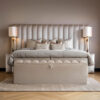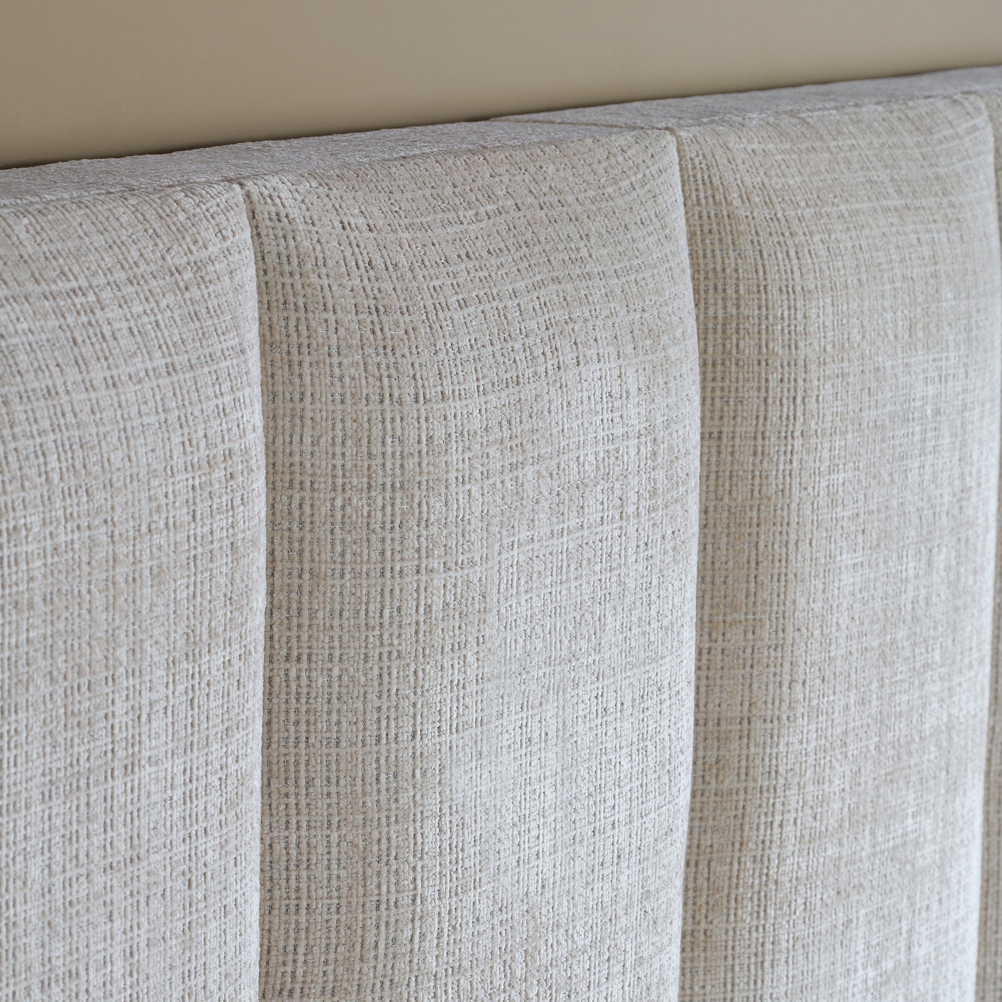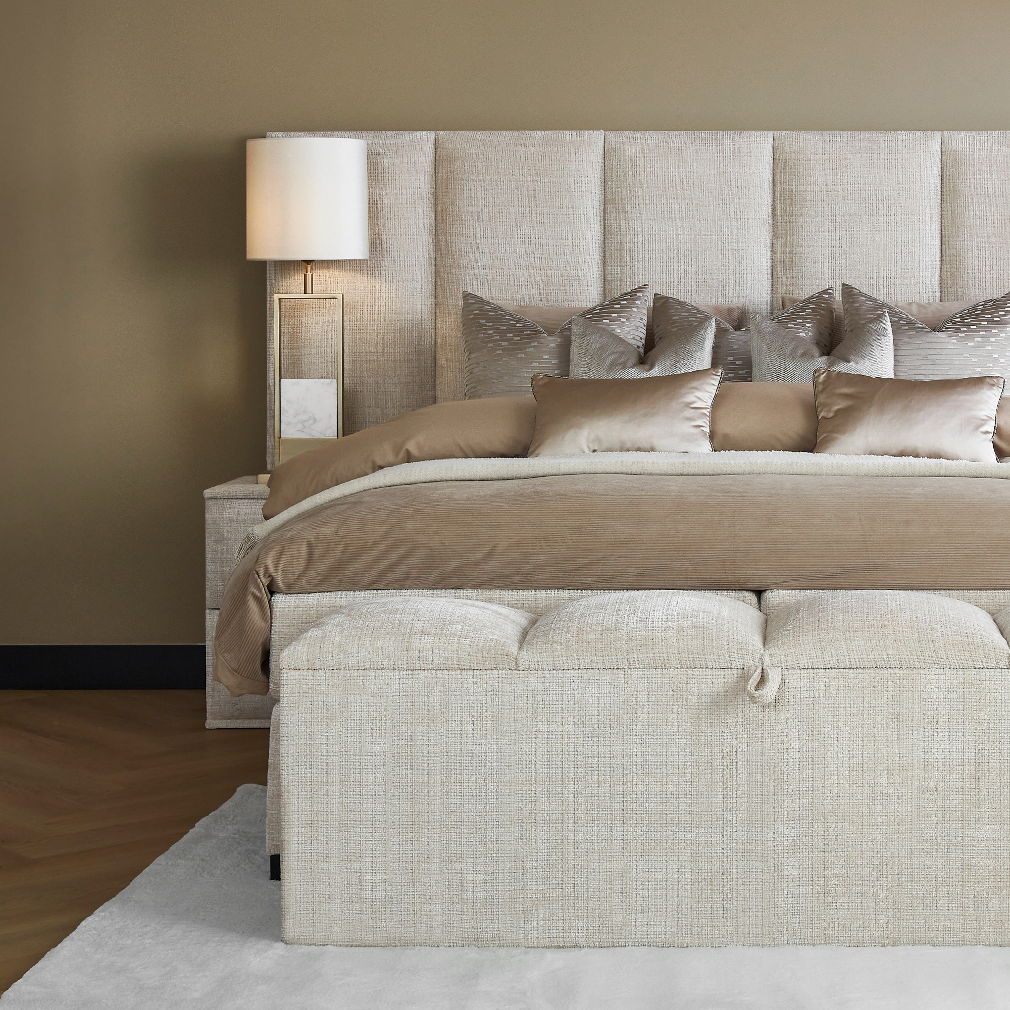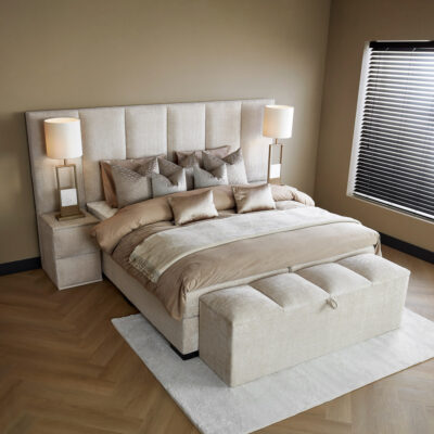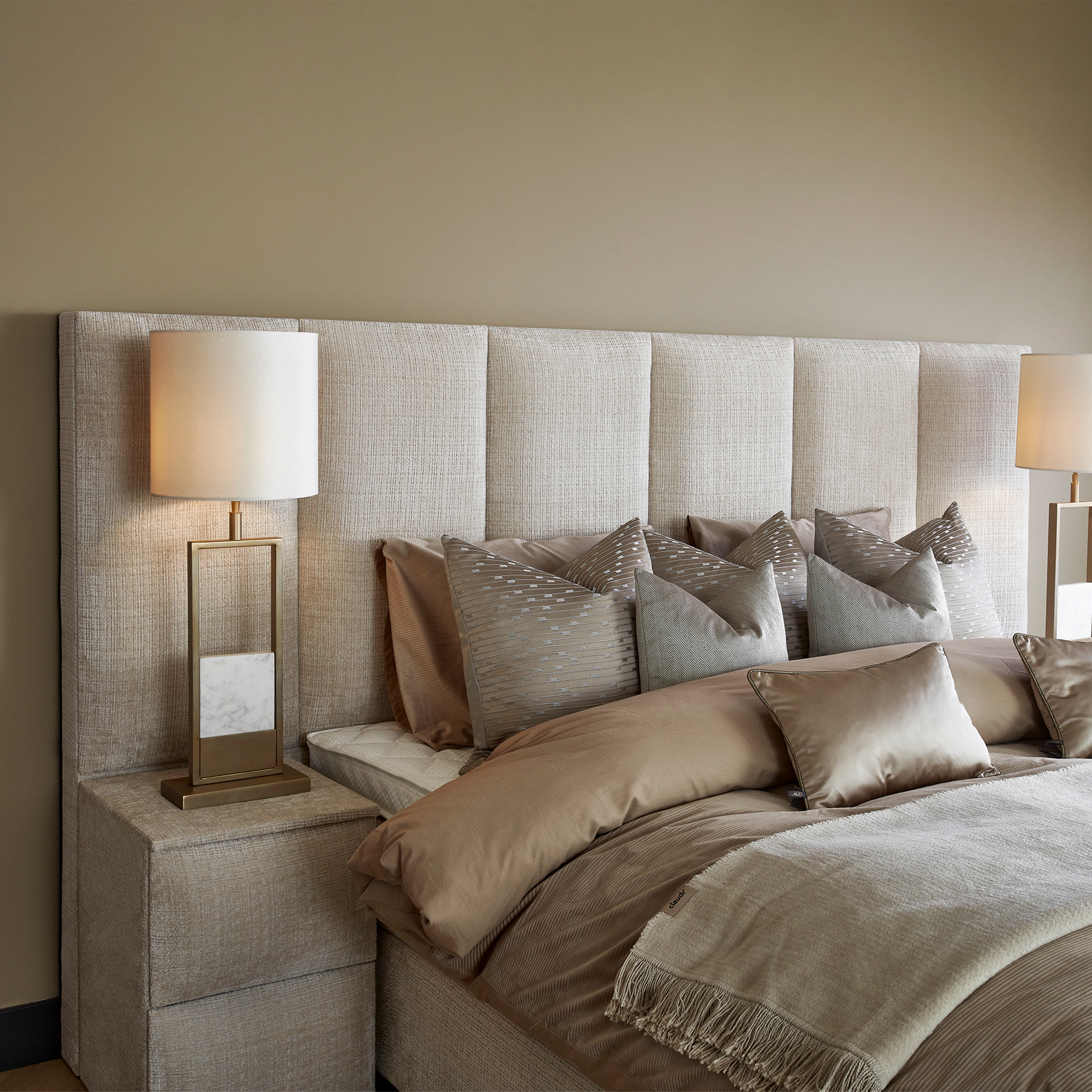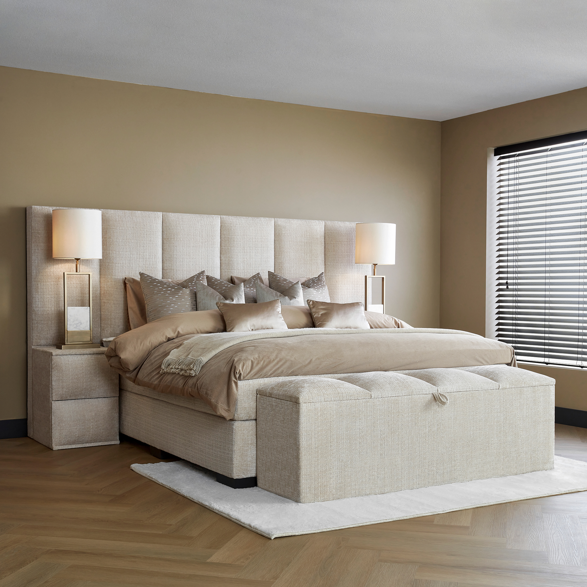 Het prachtige afgewerkte hoofdbord van de Keijzer Julius bestaat uit een tijdloos en strak model. Het hoofdbord is ca. 90 cm breder dan de breedte van het bed. De hoogte van het hoofdbord is afhankelijk van de door u gekozen opstelling. Door het luxe design met de langwerpige verticale blokken geeft dit hoofdbord een sfeervolle en elegante uitstraling aan ieder slaapkamerinterieur. Dit alles is gestoffeerd in de door u gewenste luxueuze meubelstof.
