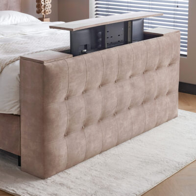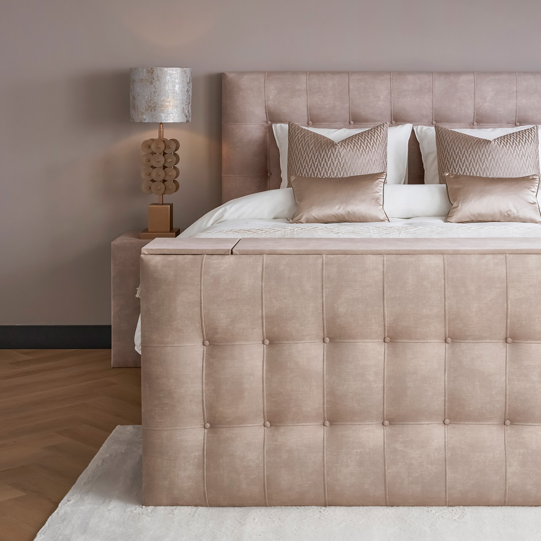 Het prachtige afgewerkte voeteneinde met geïntrigeerde TV-lift van de Helsinki Royal bestaat uit een tijdloos en strak model. Het voetenbord heeft dezelfde breedte als de afmeting van het bed. De hoogte van het voetenbord is afhankelijk van de door u gekozen opstelling. Door de horizontale en verticale stiknaden op het voetenbord ontstaat er een speels effect en een vakverdeling. Dit geeft dit model een sfeervolle en elegante uitstraling voor in ieder slaapkamerinterieur. De TV-lift geïntrigeerd in de voetenbord bied ruimte aan een tv van maximaal 43 inch. Deze is door middel van een draadloze afstandsbediening omhoog en omlaag te bedienen. Dit alles is gestoffeerd in de door u gewenste luxueuze meubelstof.