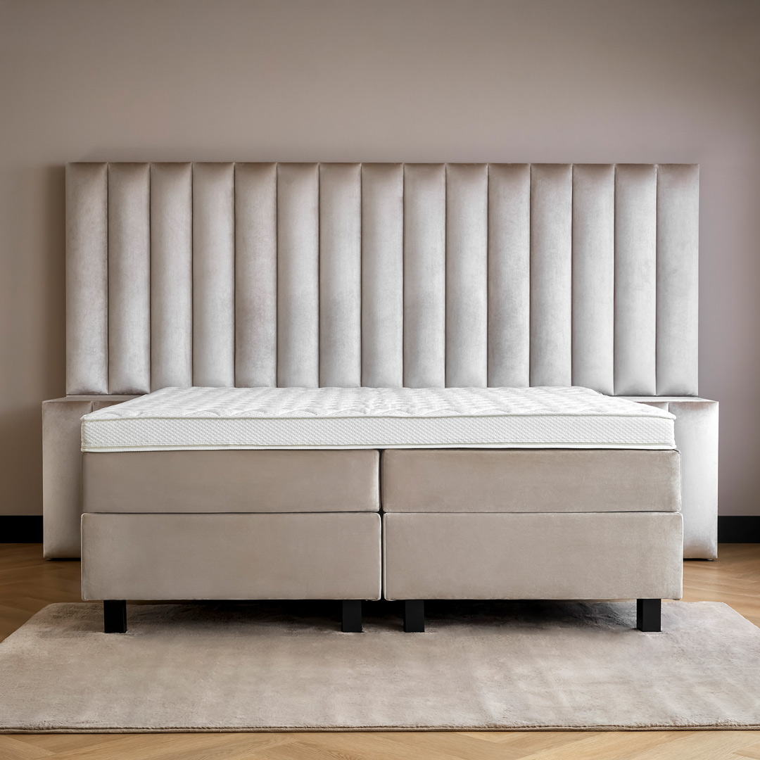 Dit zijn ca. 30 cm hoge pocket verende boxen die mee gestoffeerd zijn in de luxueuze meubelstof. De pocket boxen bevinden zich boven de 6 of 12 cm hoge poten, dit biedt een makkelijke toegang voor het schoonmaken onder de boxen. De boxen zijn gemaakt van een houten frame wat extra verstevigd is op de 6 bevestigingspunten. Door de pocket verende kern van deze boxen is dit een uitstekend ventilerende bedbodem.