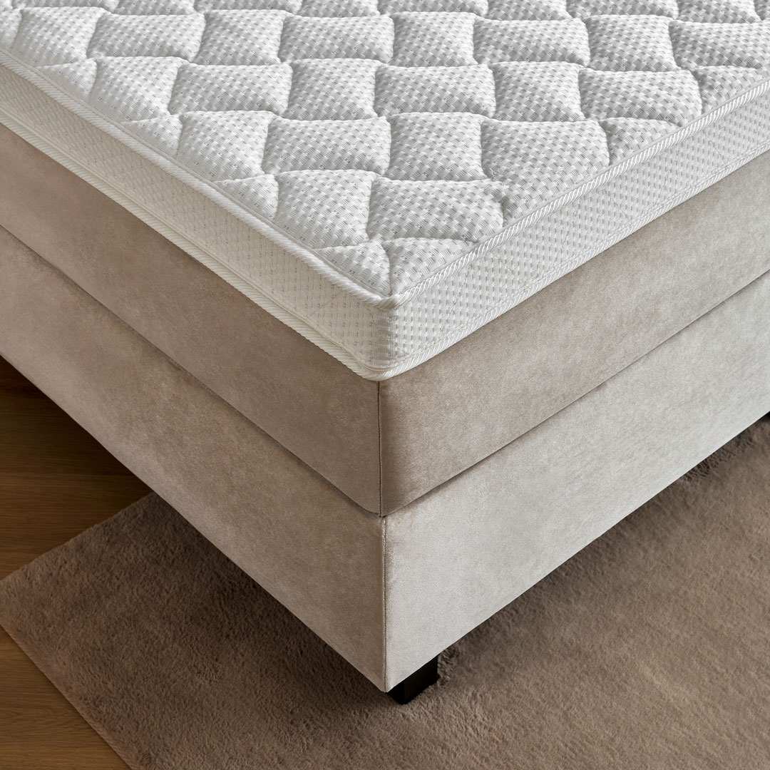 Het matras van ca. 19 cm dik is voorzien van een 7-zone pocketvering. De pocket verende kern in deze matrassen telt ca. 300 veren per m², is afgewerkt met een hoogwaardig koudschuim en mee gestoffeerd in de luxueuze meubelstof. Deze boxspring beschikt over 2 matrassen die aan beide kanten te beslapen zijn, door deze regelmatig te keren verlengt u de levensduur van uw matrassen. De hardheid van deze matrassen is medium of hard, kies de gewenste hardheid van het matras dat het beste bij jouw lichaam past. De hardheid kies je voor zowel de linker- als rechterzijde. De hardheid wordt voornamelijk bepaald door je lichaamsgewicht, hoe zwaarder je bent, hoe steviger de ondersteuning van het matras dient te zijn. De matrassen zijn belastbaar tot 120 kg.