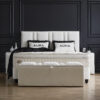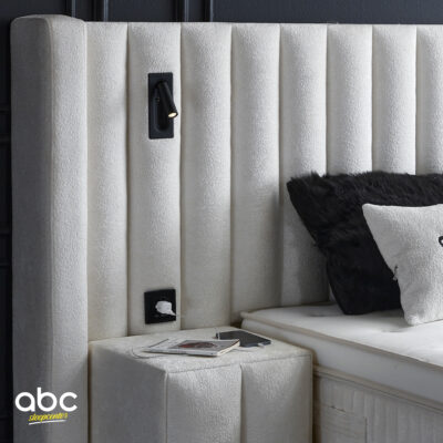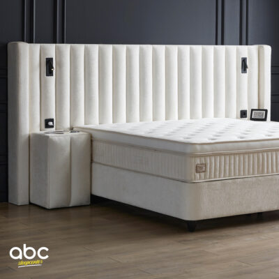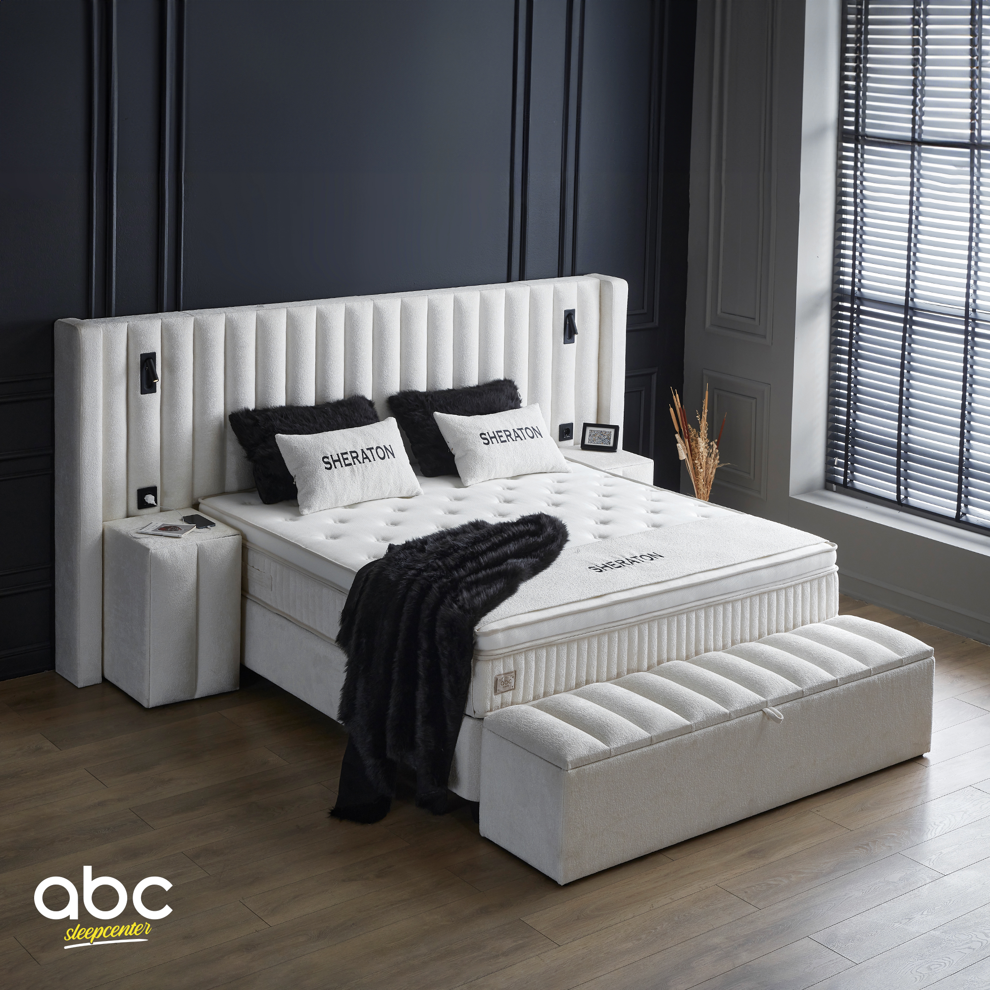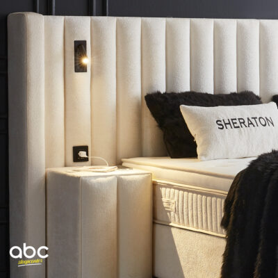Het Sheraton model van ABC heeft een strakke uitstraling door het luxe hoofdbord met de verticale mee gestoffeerde banen die over het hoofdbord verdeeld zijn. De echte luxe van dit hoofdbord zijn natuurlijk de geïntrigeerde nachtlampen, stroompunten en USB aansluitingen. Deze look geeft een fraaie, levendige uitstraling aan ieder slaapkamerinterieur. Dit hoofdbord is ca. 93 cm breder dan de gekozen bed maat en ca. 145 cm hoog. Het hoofdbord bestaat uit 4 delen, deze is verticaal gedeeld.